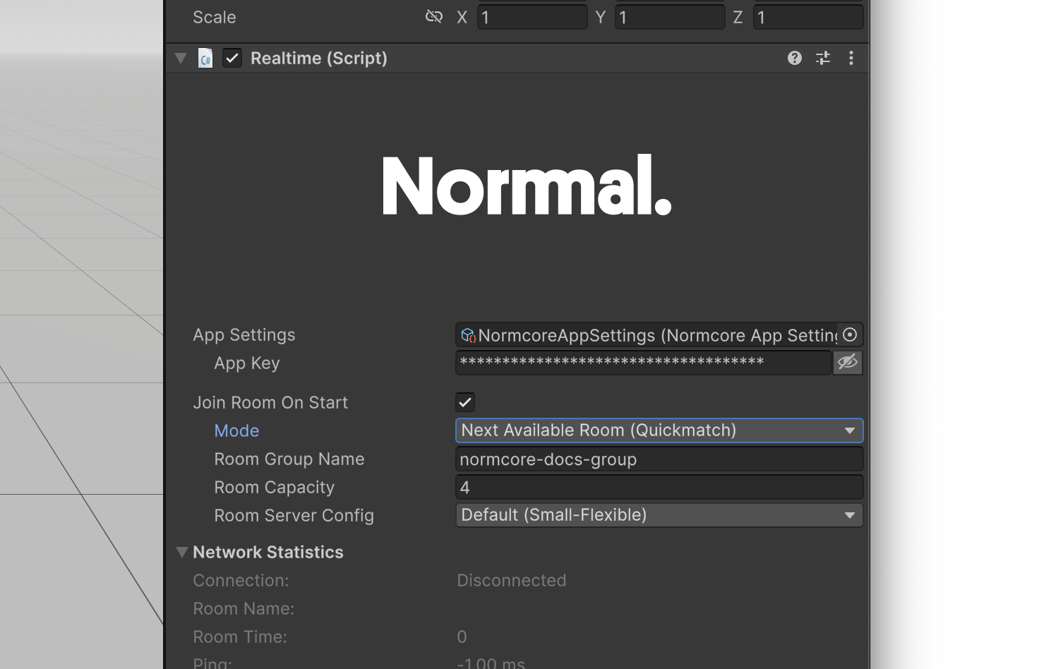 Configure the Room Group Name and Room Capacity, and Normcore will automatically send players to the next available room when the scene loads.