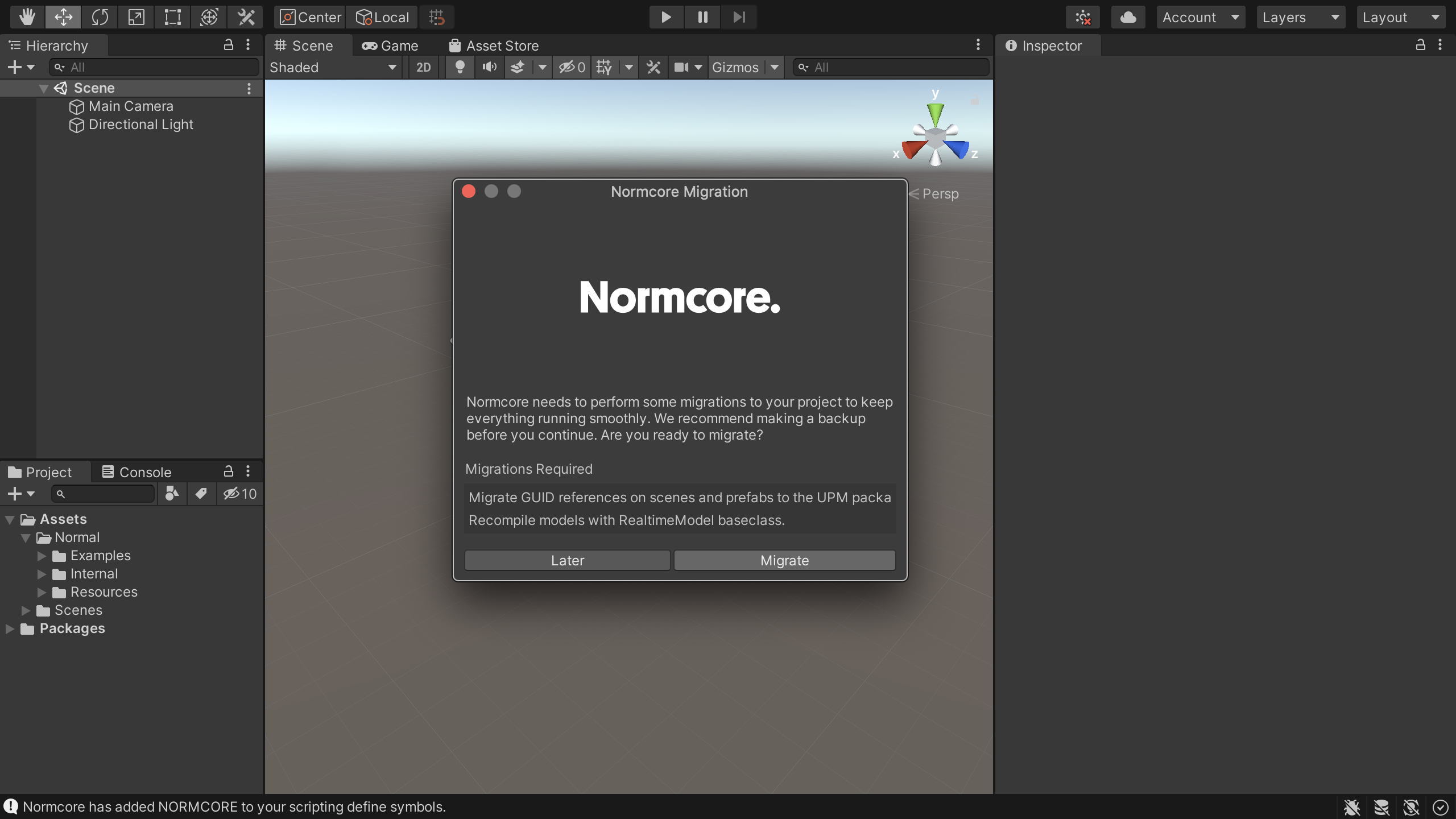 Restart Unity to reset any files altered during the import process. When Unity reopens, the Normcore Migration window will appear.