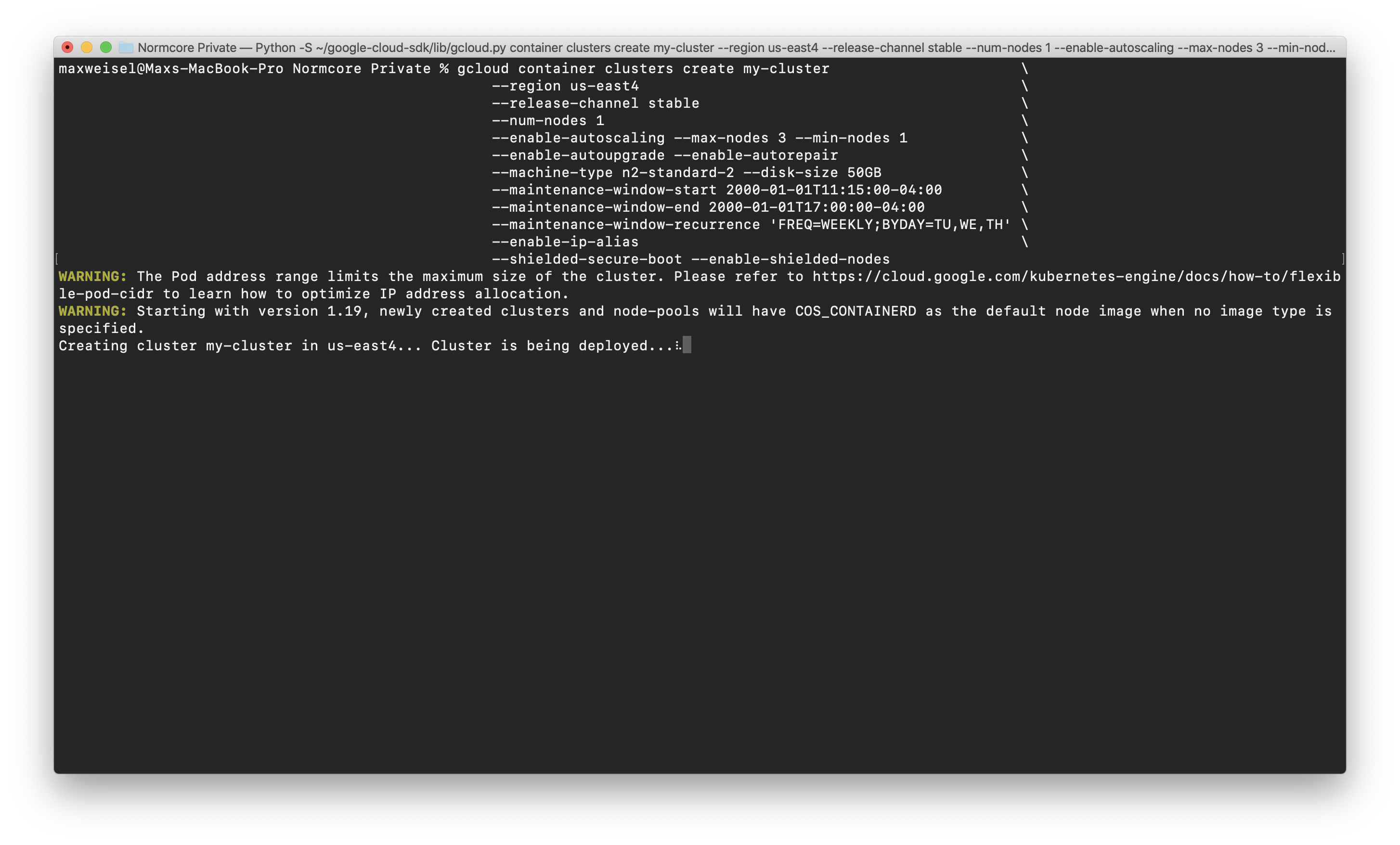 If you're creating a production regional cluster, we recommend that you set your preferred region and that you have enough Normcore Private server licenses to cover the maximum number of instances set for autoscaling. The following command sets max-nodes to 3, for a maximum of 3 instances per zone or 9 instances in total.