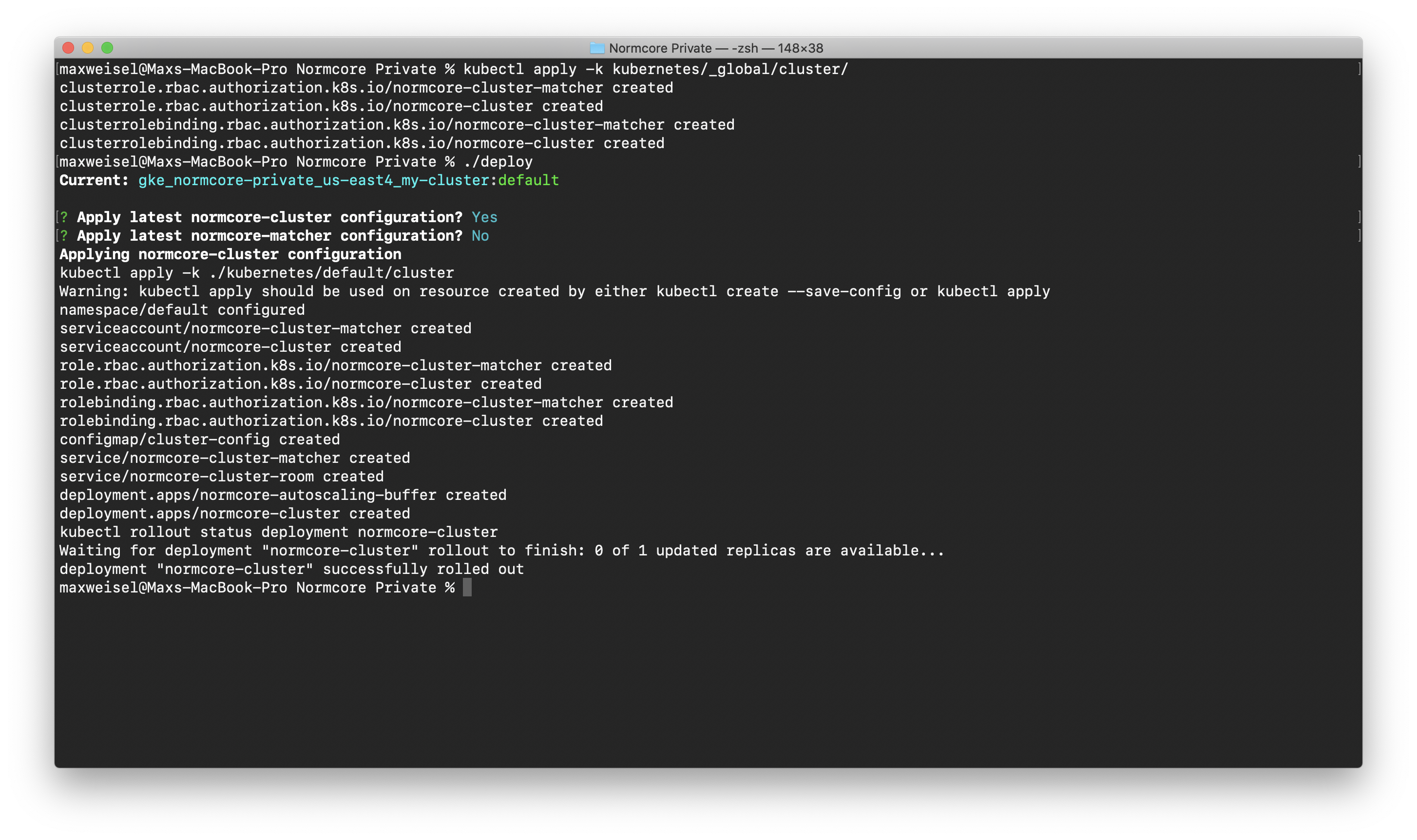 Once configured, deploy the normcore-cluster service using the ./deploy command. A successful deployment will look like this: