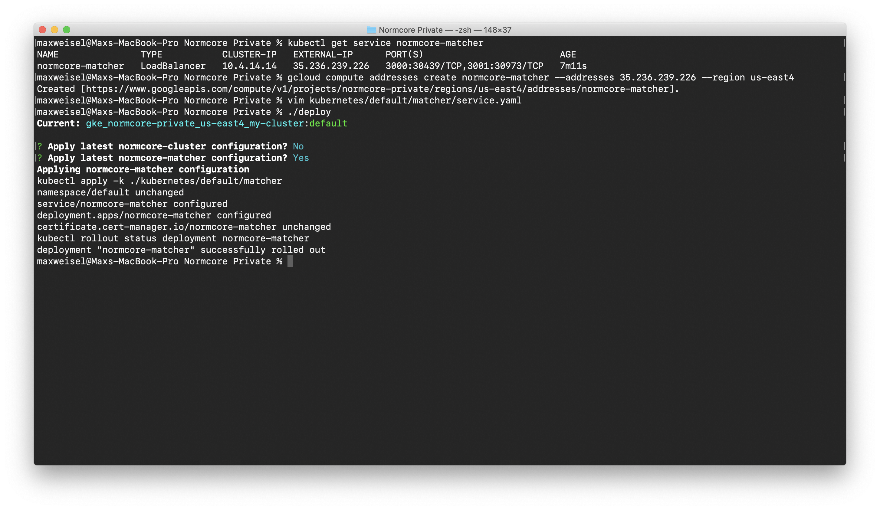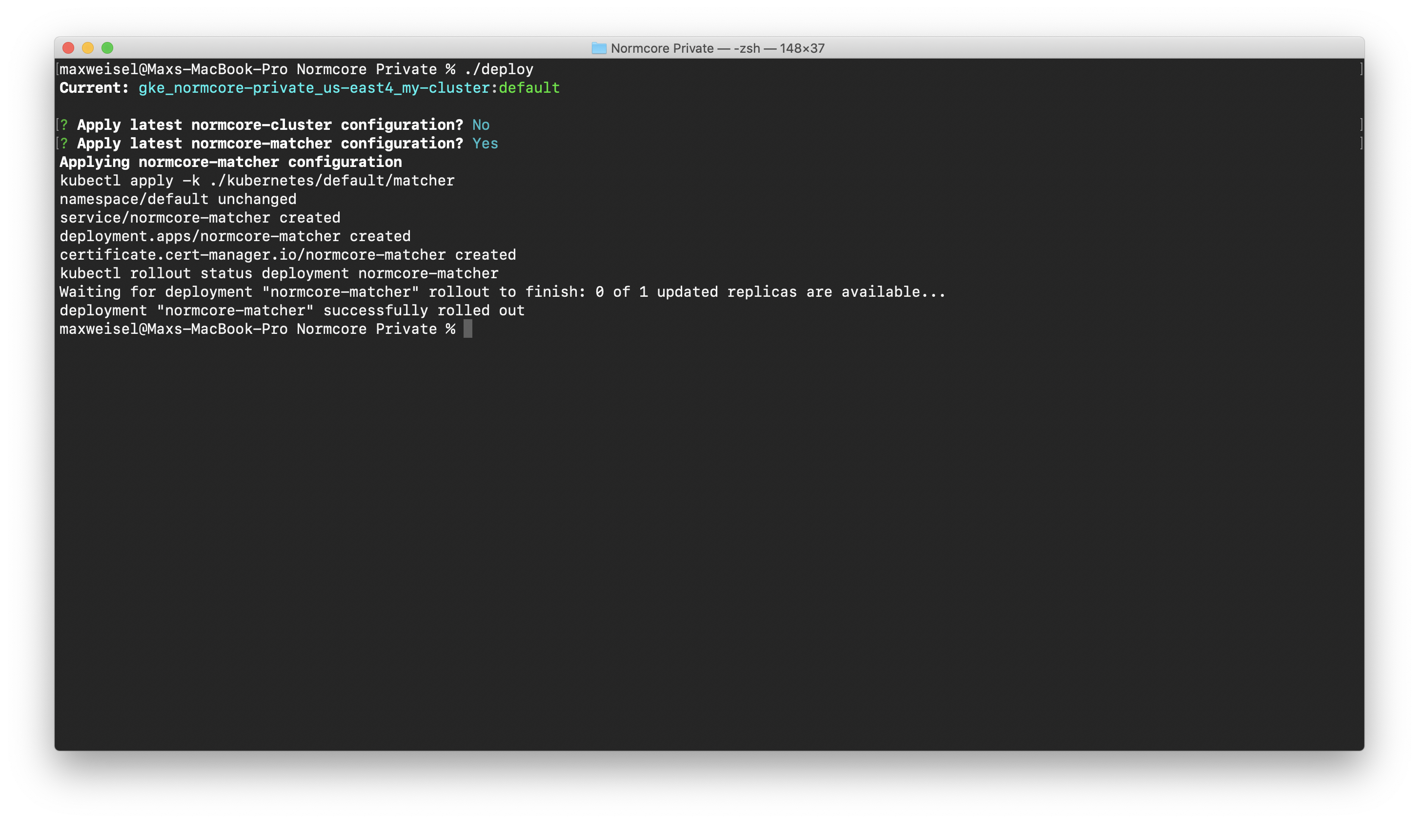 Finally, deploy the normcore-matcher service using the ./deploy command. A successful deployment will look like this: