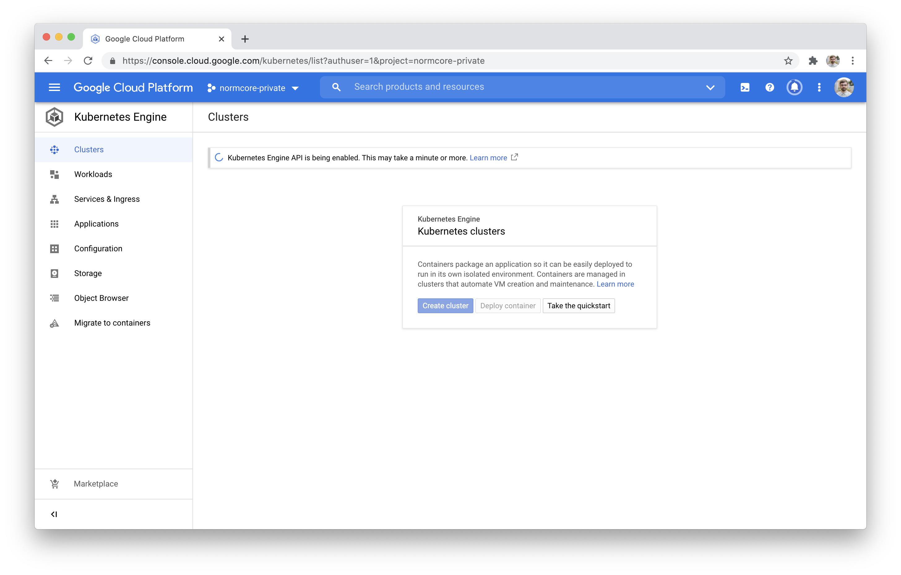 If you haven't already, create a fresh Google Cloud project and open the Kubernetes Engine tab in order to activate GKE for the project.