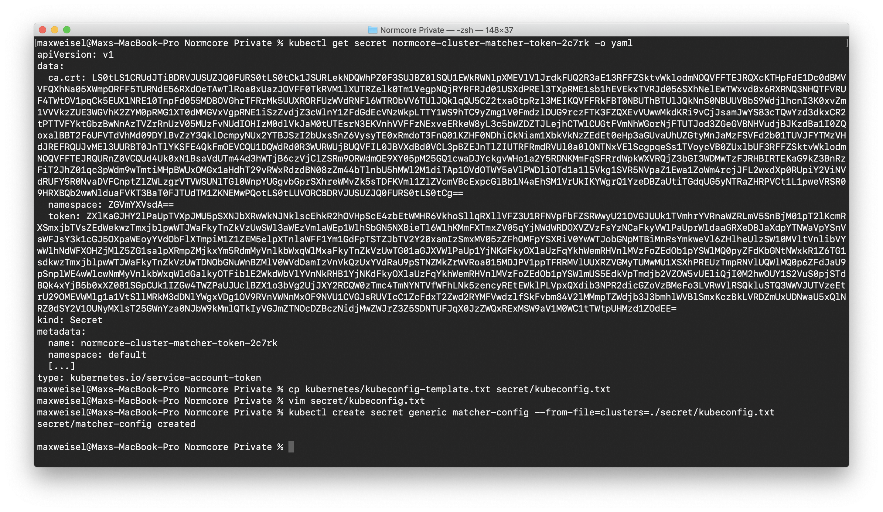 Run kubectl get serviceaccount normcore-cluster-matcher -o yaml and look at the name of the secret under which the service account credentials are stored. Then print the credentials for the service account by running kubectl get secret <SECRET NAME> -o yaml. Make note of the values for certificate and token.
