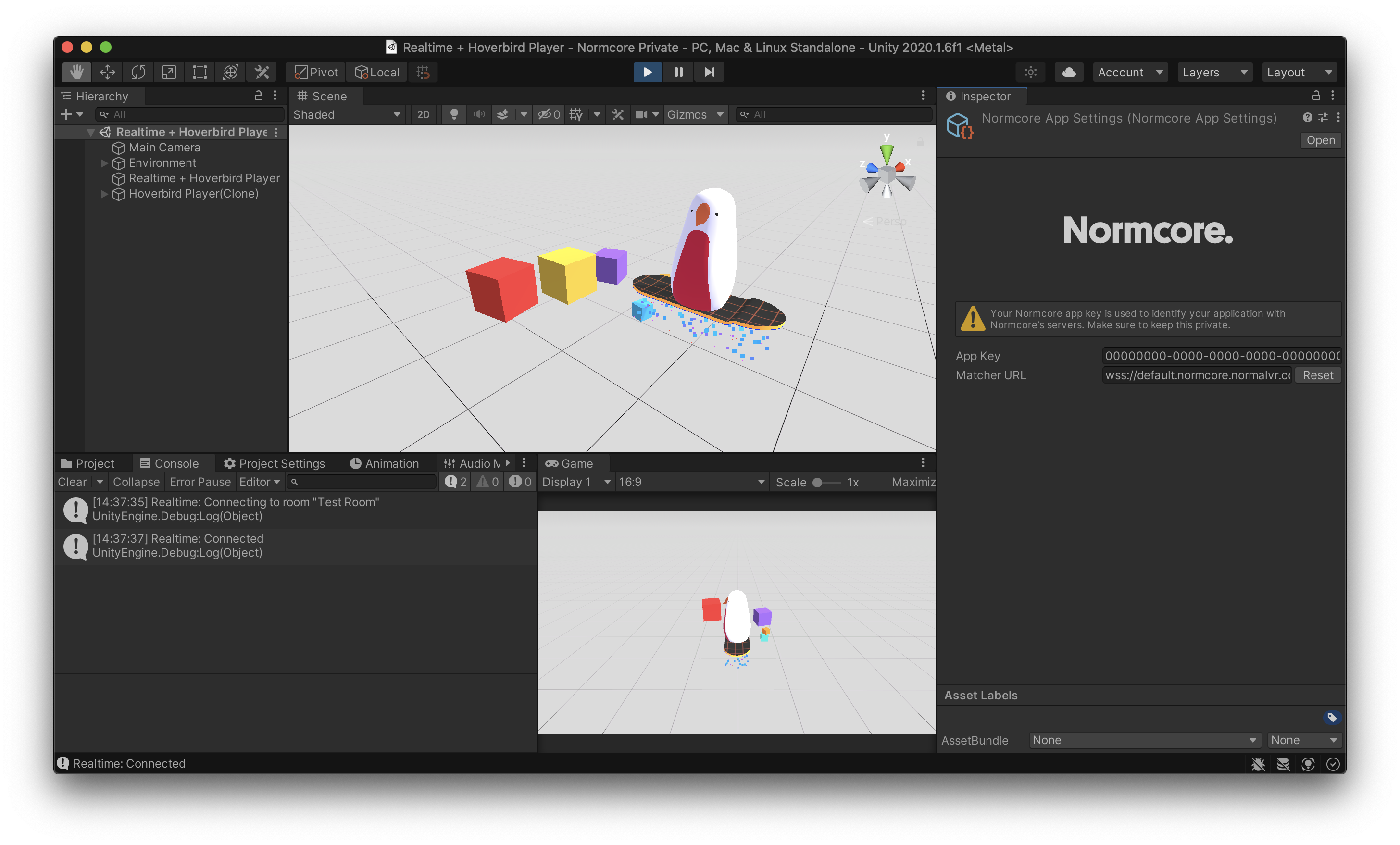 All of the hard work is done! Let's test it out. Fire up your favorite Normcore project and set the Custom Matcher URL to your new Normcore Private installation. The format should be wss://<DOMAIN NAME>:3000/, or in our case, wss://default.normcore.normalvr.com:3000/.