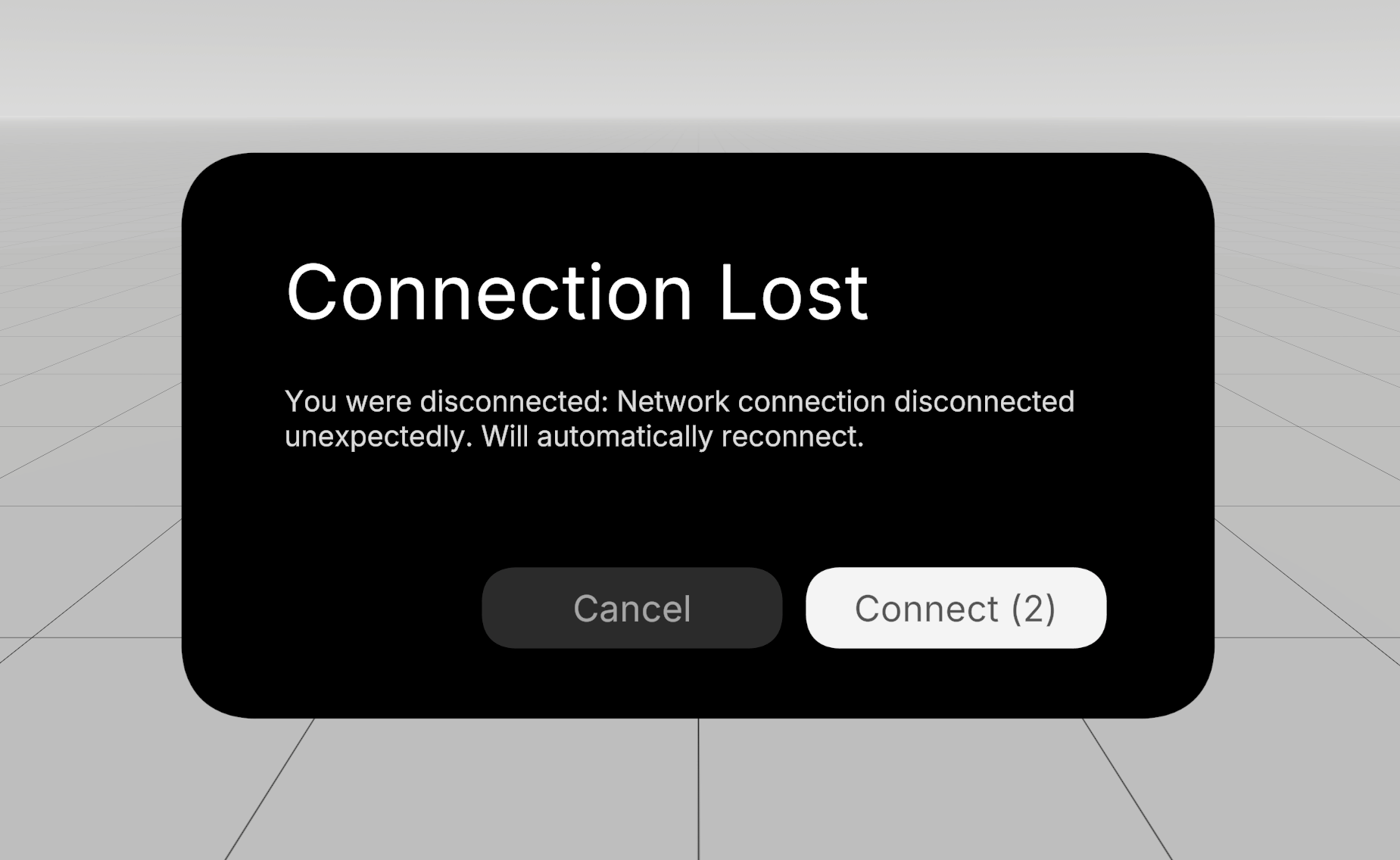 Most developers will want to display a dialog to users allowing them to cancel the reconnect or to reconnect instantly without waiting for the delay. Normcore includes a Reconnect UI prefab that integrates the AutoReconnect API as a UPM Sample.