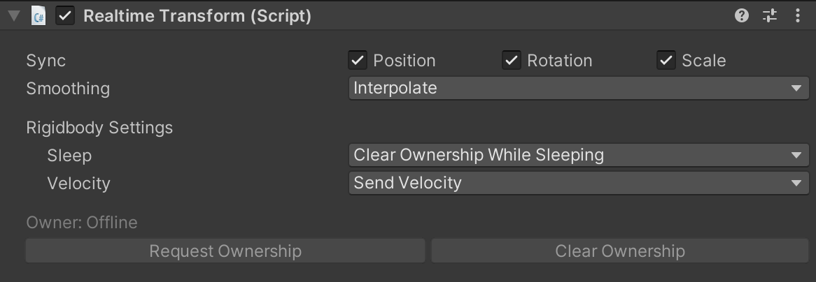 Sync Position, Rotation, and Scale: Each toggle will determine whether RealtimeTransform should synchronize the position, rotation, and scale of the game object.